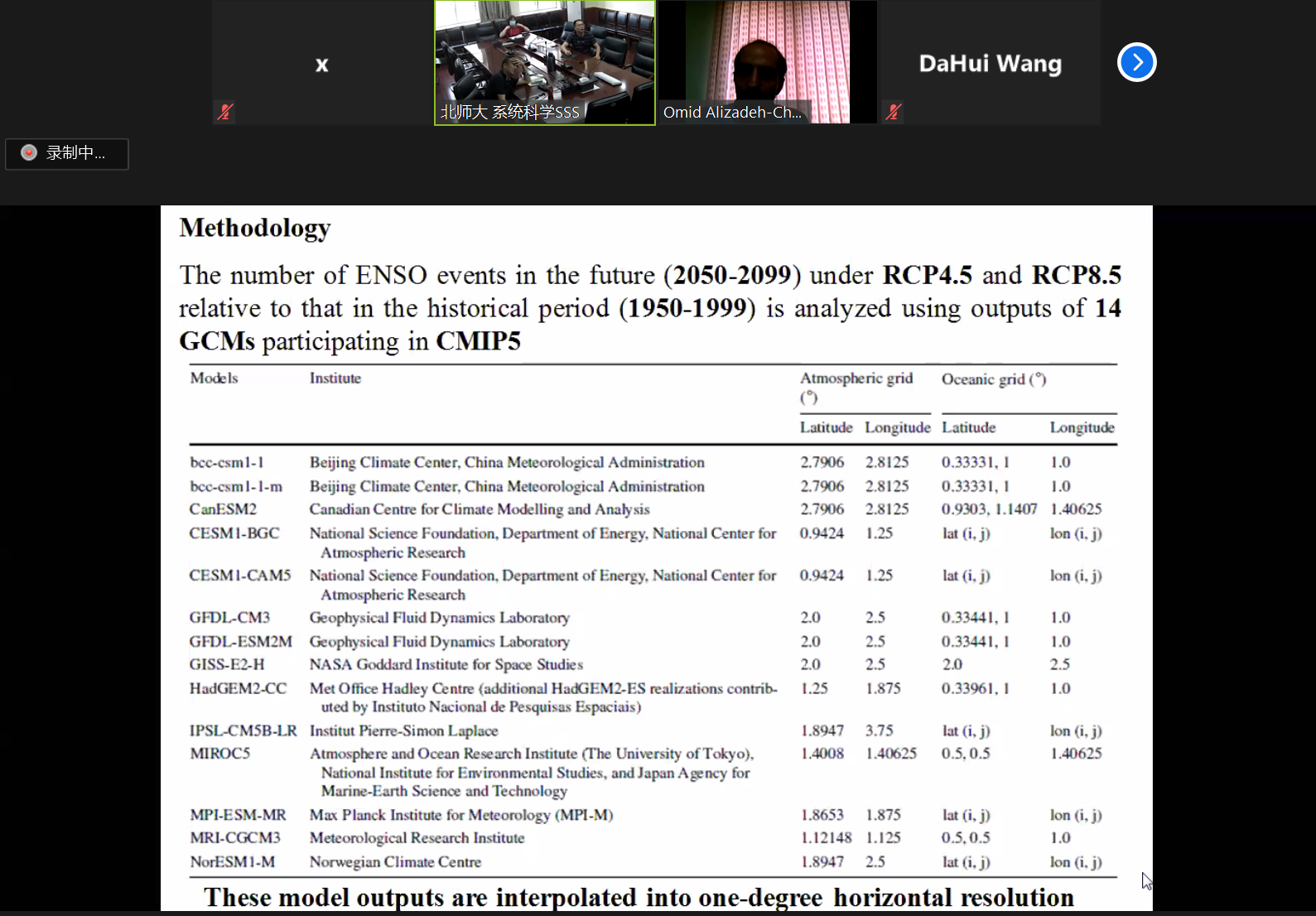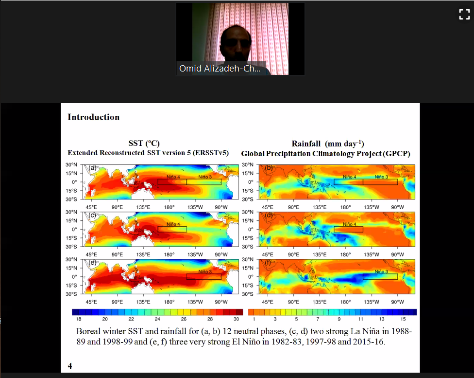 Omid Alizadeh-Choobari副教授在本次讲座中基于耦合模式比较计划第5版(CMIP5)中的14个大气环流模式(GCM)的结果,分析了未来50年(2050-2099年)在不同干预情景(RCP4.5,RCP8.5)下发生厄尔尼诺和拉尼娜事件的数量。并提到,在全球变暖的情况下,赤道东太平洋的变暖速度快于周围的海水,伴随而来的是赤道东太平洋的降雨增加,因此,热带太平洋气候平均状态的变化将类似厄尔尼诺现象。通过应用海洋Niño指数(ONI),科学家发现了在全球变暖下非常强烈的厄尔尼诺事件的数量略有增加,极端拉尼娜事件的数量增加率大于厄尔尼诺极端事件的数量。基于改进的Cai氏指数的分析表明:在全球变暖下,极端厄尔尼诺事件略有减少,而极端拉尼娜事件则略有增加。因此,先前研究得出的全球变暖下的极端厄尔尼诺现象的数量几乎翻了一番的结论与这项研究的结果相悖。